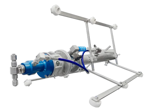 Internal Pipe Painting Equipment designed to apply internal coatings to the pipe. These attachments have a pneumatic driven spray head that will spray most all coatings from the thinnest to the most viscous. The coating to be applied is fed to the spray head through a fluid manifold for maximum material disbursement. All tools include pipe centering carriages. These tools are suitable to spray the internal diameter of pipe from 3” to 75”.